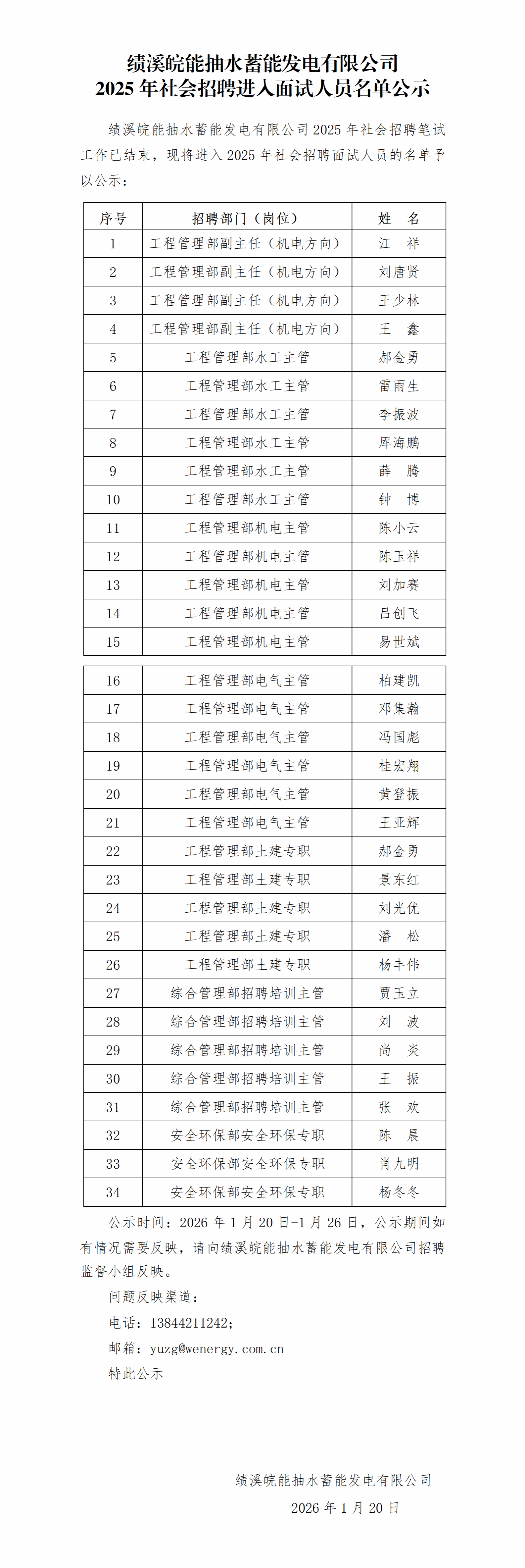 绩溪Z6尊龙凯时抽水蓄能发电有限公司2025年社会招聘进入面试职员名单公示